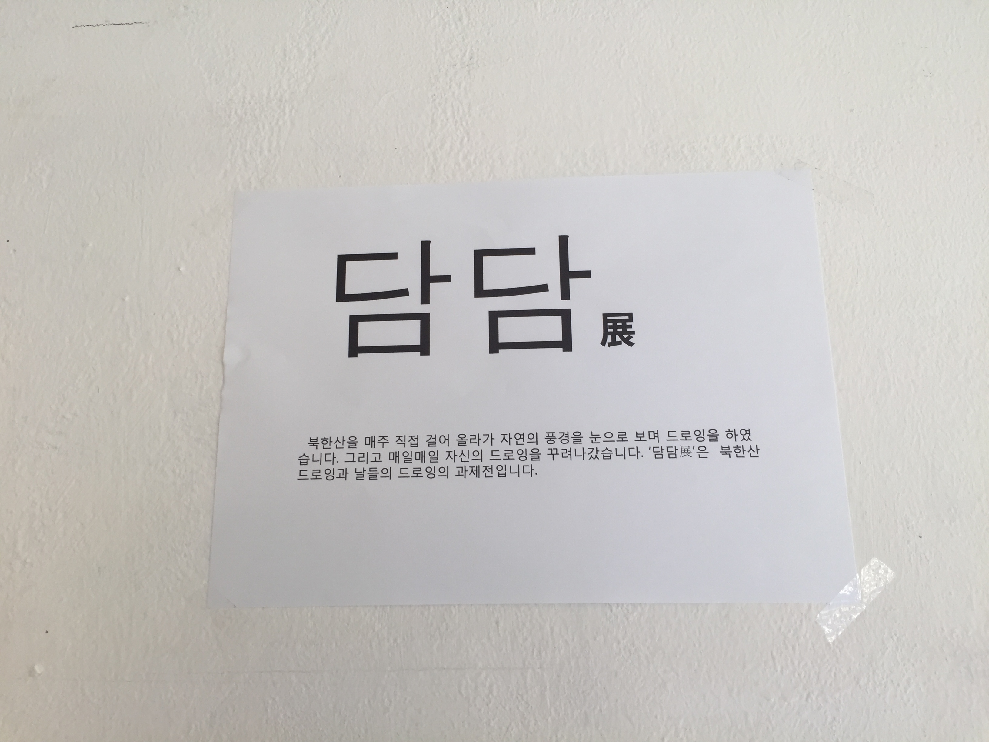 담담展 일정: 2015.12.7(월)~12.9(수) 장소: 스페이스제로 갤러리 1층 지도교수: 허윤희 전시참여자: 김서희 외 22명. ; 북한산을 매주 직접 걸어 올라가 자연의 풍경을 눈으로 보며 드로잉을 하였습니다. 그리고 매일매일 자신의 드로잉을 꾸려나갔습니다. '담담展'은 북한산 드로잉과 날들의 드로잉의 과제전입니다.